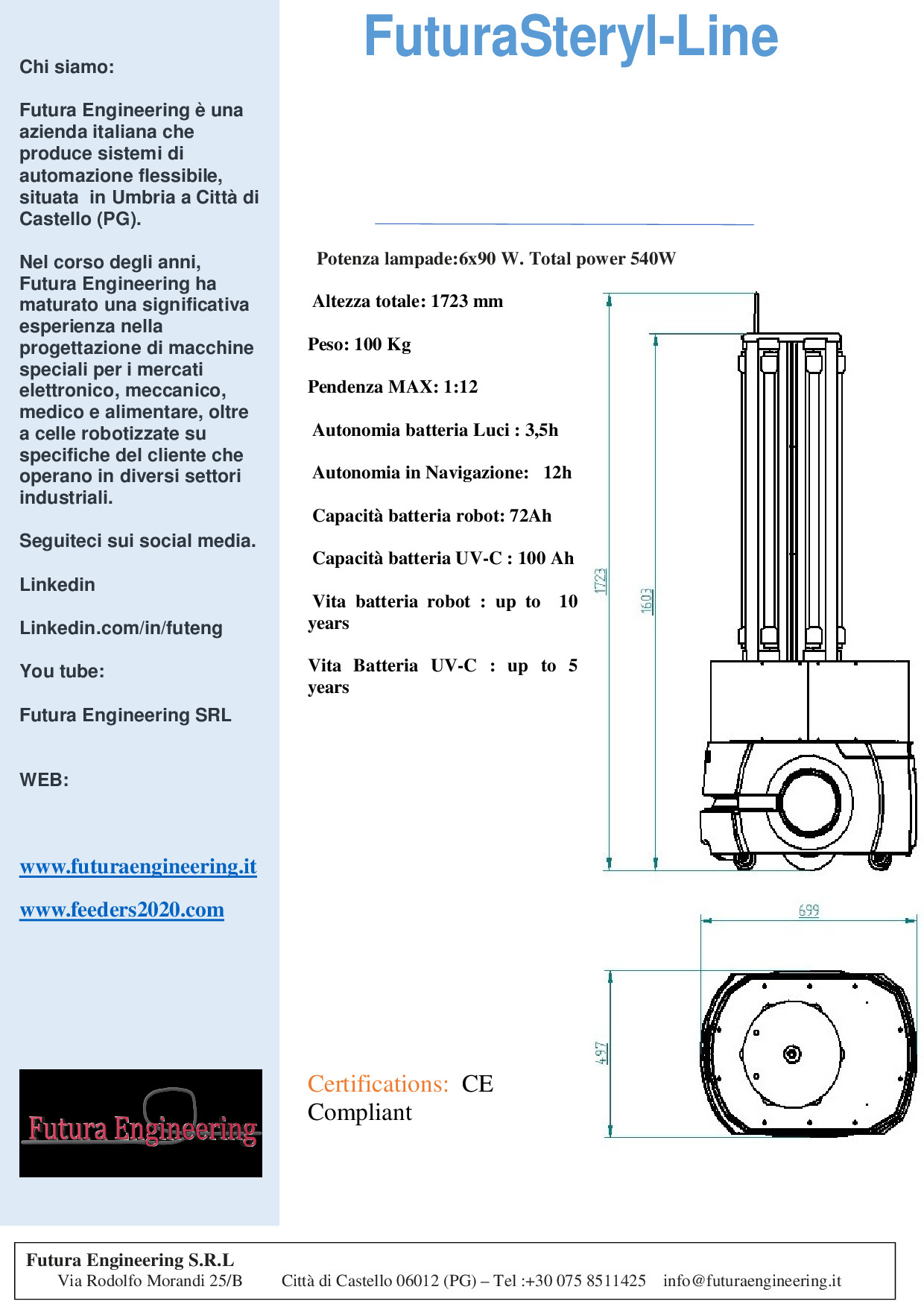 Futura Engineering s.r.l. Sede Legale: Via Madonna del Vento, 25/c – 06012 Cerbara di Città di Castello (PG) Laboratorio: Via R.Morandi 25B - 06012 Città di Castello (PG) – Tel. e Fax 0758511425 Capitale sociale €10.400,00 i.v. – C.C.I.A.A. Perugia n°175696 – Rag. Soc. n°25997 – C.F. e P.I. 02043370549 info@futuraengineering.it